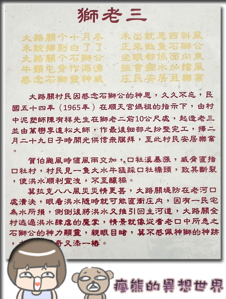 老三的由來和傳說,這三隻石獅子似乎就是守護著大路關的居民,儼然是居民重要的手護神呢!!