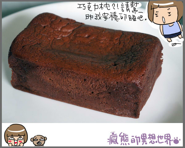 阿咧!!是蛋糕?!是巧克力?!啥咪!!是不添加澱粉和可可粉的巧克力蛋糕!!哎呀!!這手法還真的有夠獨特的,巧克力的香醇氣息,不用吃就挺深刻的,簡單的造型下(嗯...當枕頭?!邊睡邊吃XD),越來越期待它會有怎樣的表現了呢。