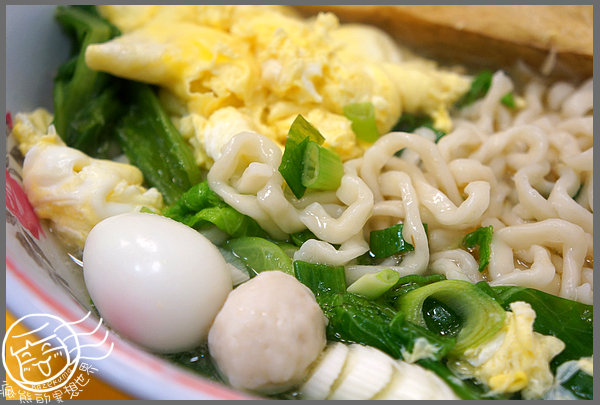 麵是我愛吃的手工麵,基本上他們家的麵有幾種可以選,我當然是手工麵啦,呵~除了一大片的蛋花外,還有油豆腐(一整塊放上來,有夠豪邁),小丸子和鳥蛋當陪襯,放了不少青菜和蔥花,算是還不錯啦,而且不愛吃太膩的可以吃這碗,還真清爽咧。